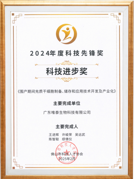 此次獲獎不僅是對唯泰生物在干細胞技術研發與產業化應用顯著成果的高度認可,也是對其在推動干細胞技術創新、引領細分行業發展以及為佛山地區生物醫藥產業轉型升級所作貢獻的有力證明。